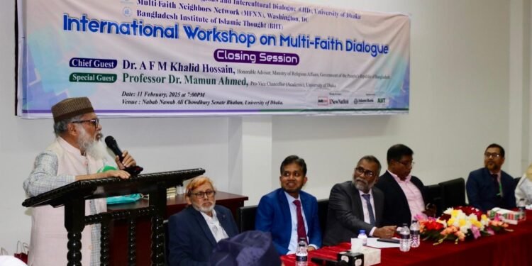 বহুধর্মীয় সংলাপ বিষয়ক আন্তর্জাতিক কর্মশালা ইন্টারন্যাশনাল ওয়ার্কশপ অন মাল্টিফেইথ ডায়লগের (আইডব্লিওএমডি-২০২৫) সমাপনী সেশন গত মঙ্গলবার শেষ হয়েছে। ঢাকা বিশ্ববিদ্যালয়ের নবাব নওয়াব আলী চৌধুরী সিনেট ভবন মিলনায়তনে দুই দিনব্যাপী এ কর্মশালা অনুষ্ঠিত হয়। খবর বাপসনিউজ। সমাপনী সেশনে প্রধান অতিথি ছিলেন ধর্ম বিষয়ক মন্ত্রণালয়ের উপদেষ্টা ড. এ.এফ.এম. খালিদ হোসেন।